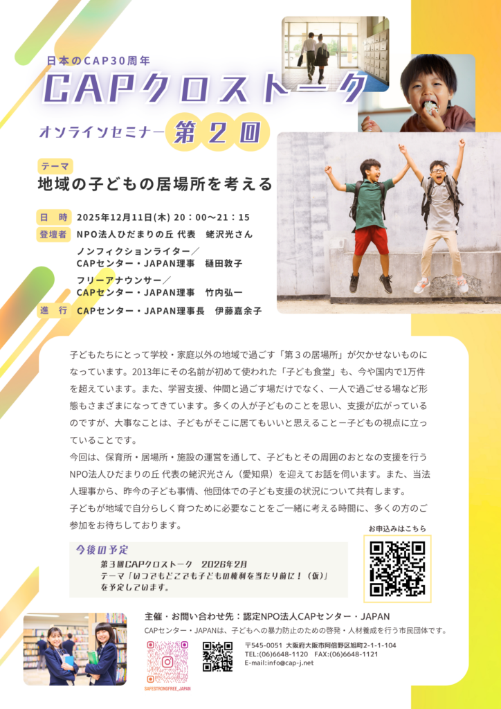 【12月11日開催オンラインセミナー】CAPクロストーク第2回 日本のCAP30周年【テーマ:地域の子どもの居場所を考える】