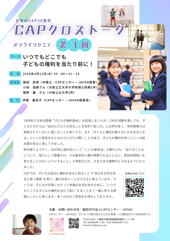 【2026年2月12日開催オンラインセミナー】CAPクロストーク第3回 日本のCAP30周年【テーマ:いつでもどこでも子どもの権利を当たり前に!】