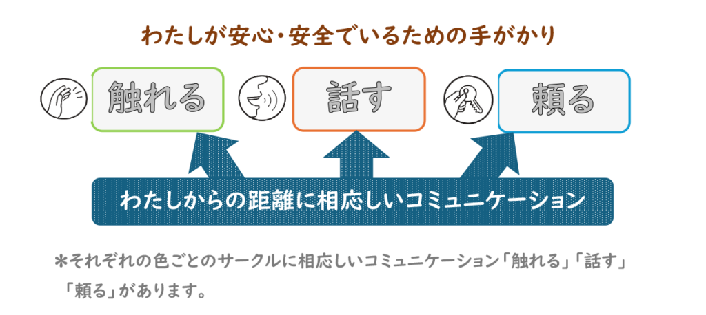 (*3)他者との安心・安全なからだとこころの距離を色分けした7色の同心円。色ごとに相応しい「触れる」・「話す」・「頼る」がある。